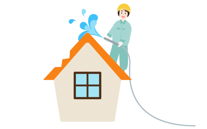 高圧洗浄機を使って屋根のほこりや汚れを除去したり、塗料の劣化によって壁の表面にできた粉を落としたりします。「下地処理」の前に行うこともあります。
